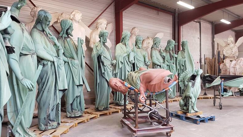 1861년 노트르담 첨탑에 설치된 16개의 동상은 비올레 르 뒥(Eugène Viollet-le-Duc)이 그리고 조프루아 데숌(Adolphe Victor Geoffroy-Dechaume)이 모델링한 12사도와 4명의 복음서 저자를 상징합니다. 이 조각상들은 화재가 났을 때 운 좋게 화재로부터 탈출할 수 있었습니다. 화재가 나기 4일 전인 2019년 4월 11일 철거된 동상은 복원을 담당하는 SOCRA의 아틀리에로 옮겨졌기 때문이죠.